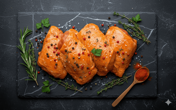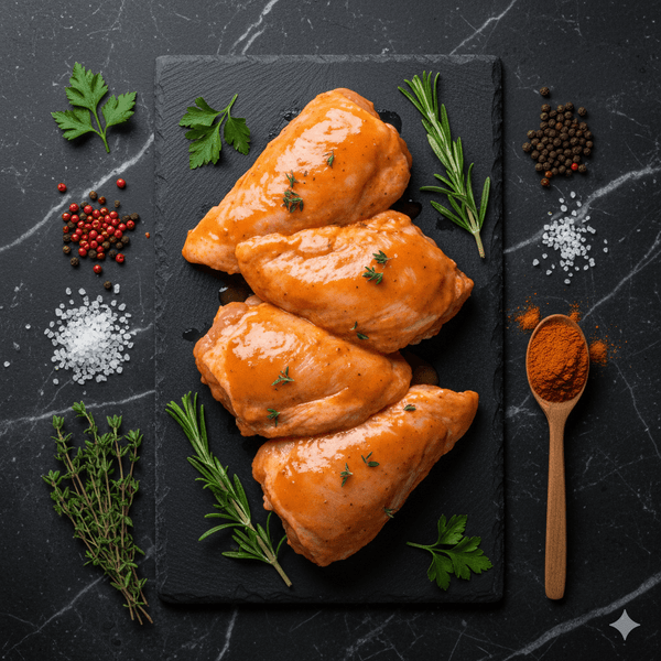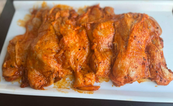 Lyon Boucherie vous propose les cuisses de poulets entièrement désossé et mariné deux parfums :